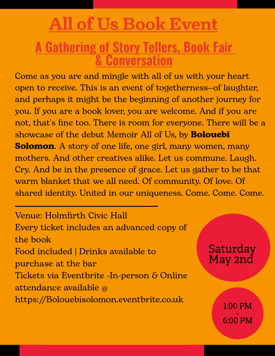 There will be a showcase of the debut Memoir All of Us, by Bolouebi Solomon. A story of one life, one girl, many women, many mothers and other creatures alike. Let us commune, laugh, cry and be in the presence of grace. Let us gather to be that warm blanket that we all need of community, of love, of shared identity. United in our uniqueness. Come, come, come.