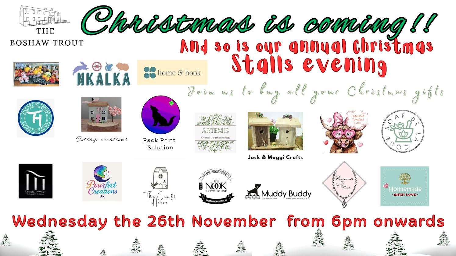Christmas Shopping Evening – The Boshaw Trout Nov 26 Featured 6:00 pm Christmas Shopping Evening – The Boshaw Trout