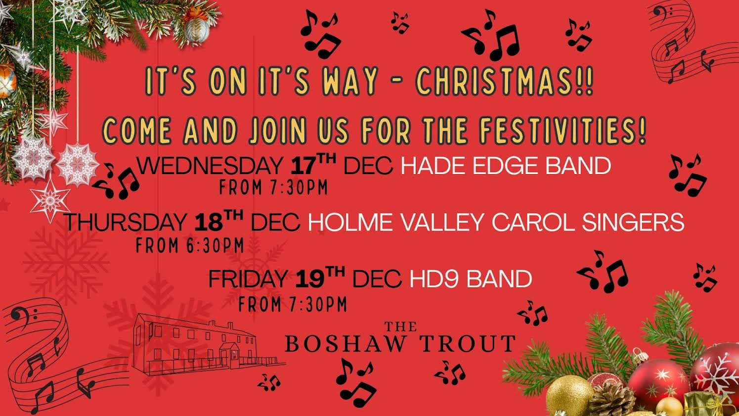 Christmas Carols & Bands at The Boshaw Trout Dec 17 Featured 7:30 pm Christmas Carols & Bands at The Boshaw Trout