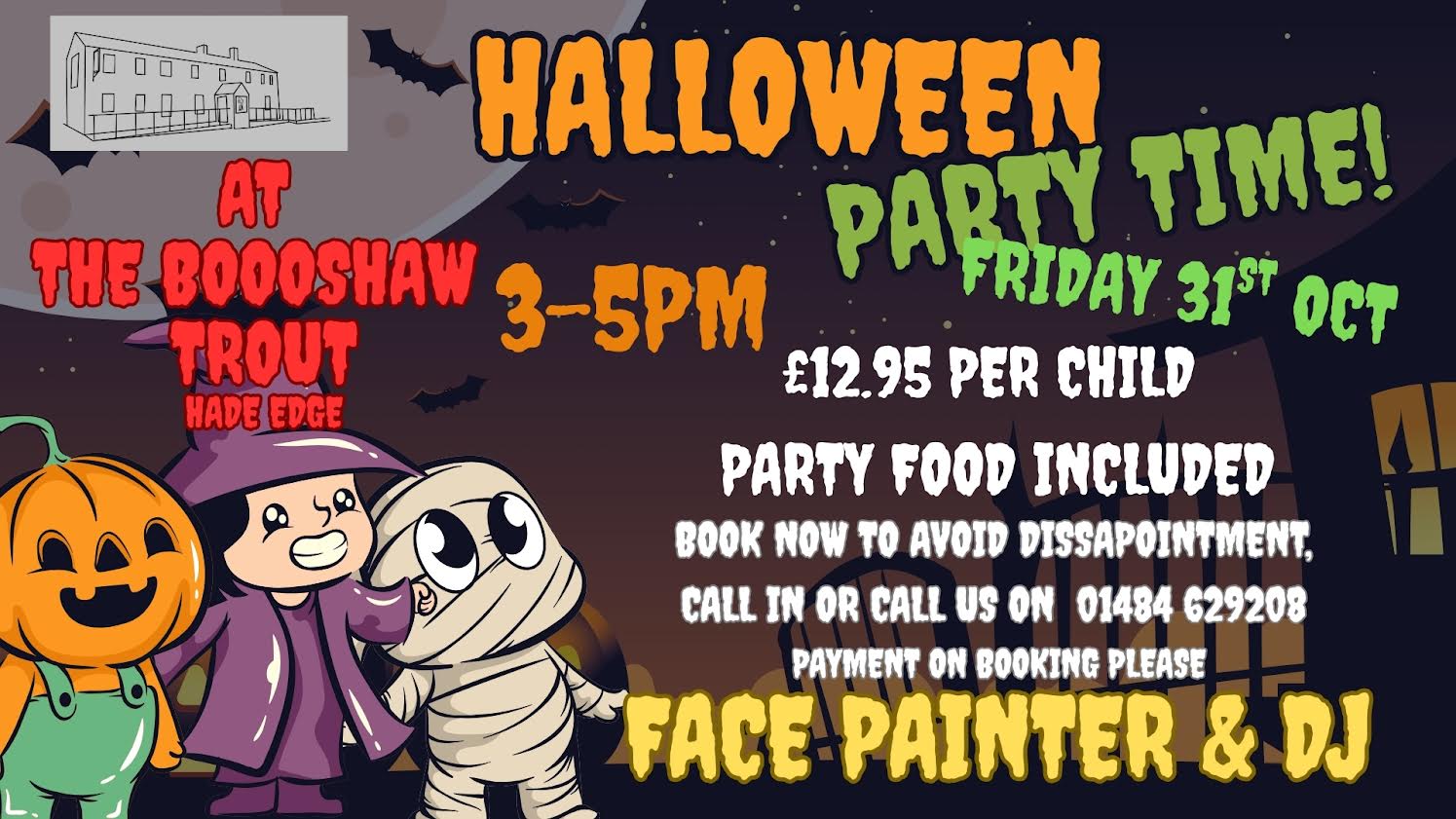 Kids Halloween Party at The Bowshaw Trout Oct 31 Featured 3:00 pm - 5:00 pm Kids Halloween Party at The Bowshaw Trout £12.95